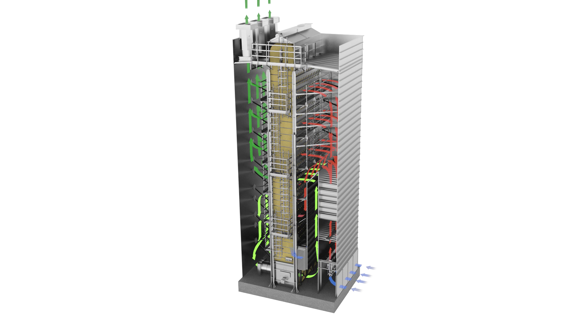 Вытяжные вентиляторы оснащены автоматическими жалюзи защиты от дождя. Встроенная система пылеподавления.